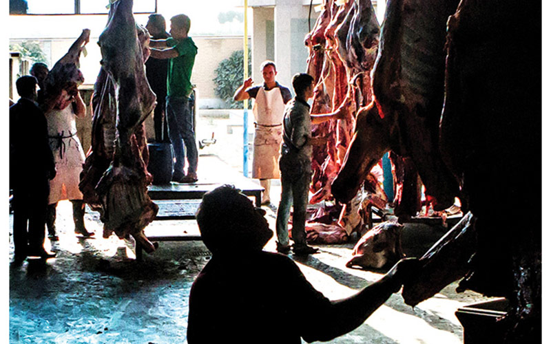 سلاخ‌ها، چاقوبه‌‌دست، ایستاده‌اند. گاوها و گوسفندها از مخزنی سرپوشیده‌ به‌ردیف جلو می‌آیند تا برسند به پایان عمر. شوک‌زن الکتریکی اولین ضربه‌ی مرگ را وارد می‌کند بر تن چاق حیوان و بدنش را بی‌حس می‌کند. دستگاه پاها را می‌برد بالا. سر درست می‌افتد جلو دست سلاخ. سَرسلاخ فرمان کشتار را صادر می‌کند. سلاخ، با یک ضربه‌ی چاقو، سر حیوان را از تن جدا می‌کنند. خون می‌پاشد به اطراف. روحانی به‌دقت بر کار ذبح شرعی نظارت می‌کند. چهارپایان اتوماتیک‌ روبه‌قبله می‌شوند. خون تنشان اول به‌سرعت شُره می‌کند و بعد آرام‌آرام و قطره‌قطره پایین می‌غلتد. نفر بعدی با کمک دستگاه پوست را جدا می‌کند و بعدی احشا را. روده‌ها را می‌اندازد توی ریل. روده روی ریل سُر می‌خورد به سمت یک تونل. روده‌ها از داخل تونل می‌افتند به مخزنی که یک‌طبقه پایین‌تر است. دور و بر مخزن مردانی ایستاده‌اند. روده‌ها را سریع برمی‌دارند و تمیز می‌کنند. آب می‌ریزند توی روده‌ها. دست‌ها را مشت می‌کنند گِرد روده و کثافت را می‌ریزند بیرون. روده‌ها که تمیز شدند، ده ‌تا ده ‌تا بسته‌بندی‌شان می‌کنند. بوی گند و گه در سالن پیچیده است.